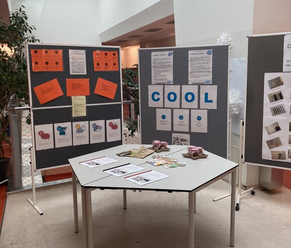 In der Aula der Schule standen Guides und Lehrkräfte für Informationsgespräche zur Verfügung und beantworteten Fragen zum Schulalltag, zu Voraussetzungen des Schulbesuchs und Anmeldeformalitäten.